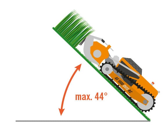 La segadora de pendientes controlada por radio con su diseño compacto (183 cm de largo, 114 cm de ancho, 69 cm de alto) siega terrenos difíciles y áreas de difícil acceso sin ningún problema, gracias al control remoto desde una distancia segura. El freno de estacionamiento mecánico automático proporciona seguridad adicional al trabajar en pendientes. Las unidades de orugas de grandes dimensiones con inserciones de acero garantizan una baja presión sobre el suelo, una transmisión de potencia ideal y el mejor agarre en pendientes pronunciadas. El motor Vanguard Professional de baja altura, montado horizontalmente, con lubricación de aceite optimizada y la baja altura total son los prerequisitos para el bajo centro de gravedad, la extrema adecuación a pendientes y la siega bajo obstáculos profundos, por ejemplo en parques solares.