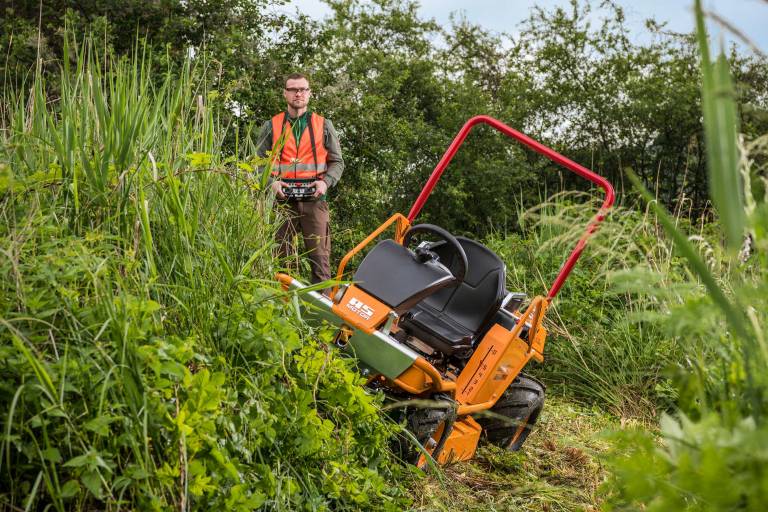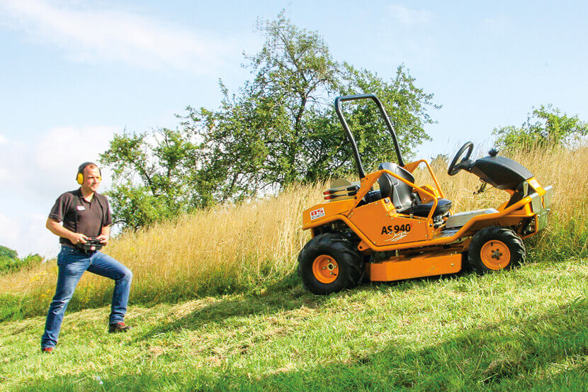 Sí, hay áreas que prefiero cortar en modo manual porque es más rápido. Pero tan pronto como el terreno se vuelve irregular o la vegetación es alta y densa, cambio inmediatamente al control remoto’, explica Rief.