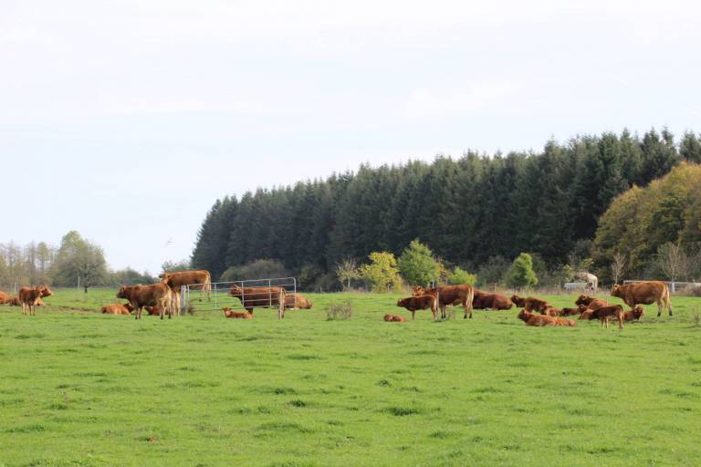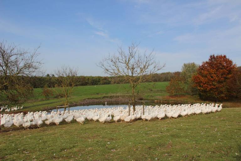 A lo largo de las décadas, la finca agrícola se ha desarrollado en un negocio imponente. Ahora incluye un edificio residencial, un matadero, una carnicería, una tienda de la granja, invernaderos, cultivo de vegetales y frutas y numerosos establos. Un total de 40 empleados a tiempo completo y 170 empleados supervisados trabajan actualmente en la finca agrícola y gestionan aproximadamente 200 hectáreas de pasto, tierra arable y huertos. "Con la excepción de las cabras, tenemos casi todas las razas de ganado en la granja", dice el agrónomo con orgullo y comienza a enumerar: "Nuestra manada de Limousin actualmente consiste en 60 vacas nodrizas con crías, mantenemos nuestros 250 cerdos de engorde en un establo abierto con cama de paja, y un poco más arriba del terreno tenemos caballos Kunig, que se utilizan principalmente para el mantenimiento del paisaje. Además, hay 150 ovejas de la raza Schwarzkopf y 600 pavos, así como 600 gansos estacionalmente. En el sector avícola, sin embargo, nuestro producto más importante es la carne de pollo fresca, que sacrificamos en nuestro propio matadero avícola. Actualmente tenemos alrededor de 3500 pollos, pero estamos en proceso de construir un gallinero con capacidad para 9000 pollos".
