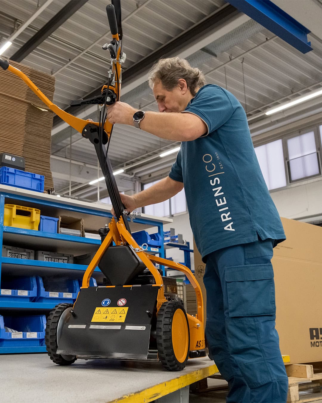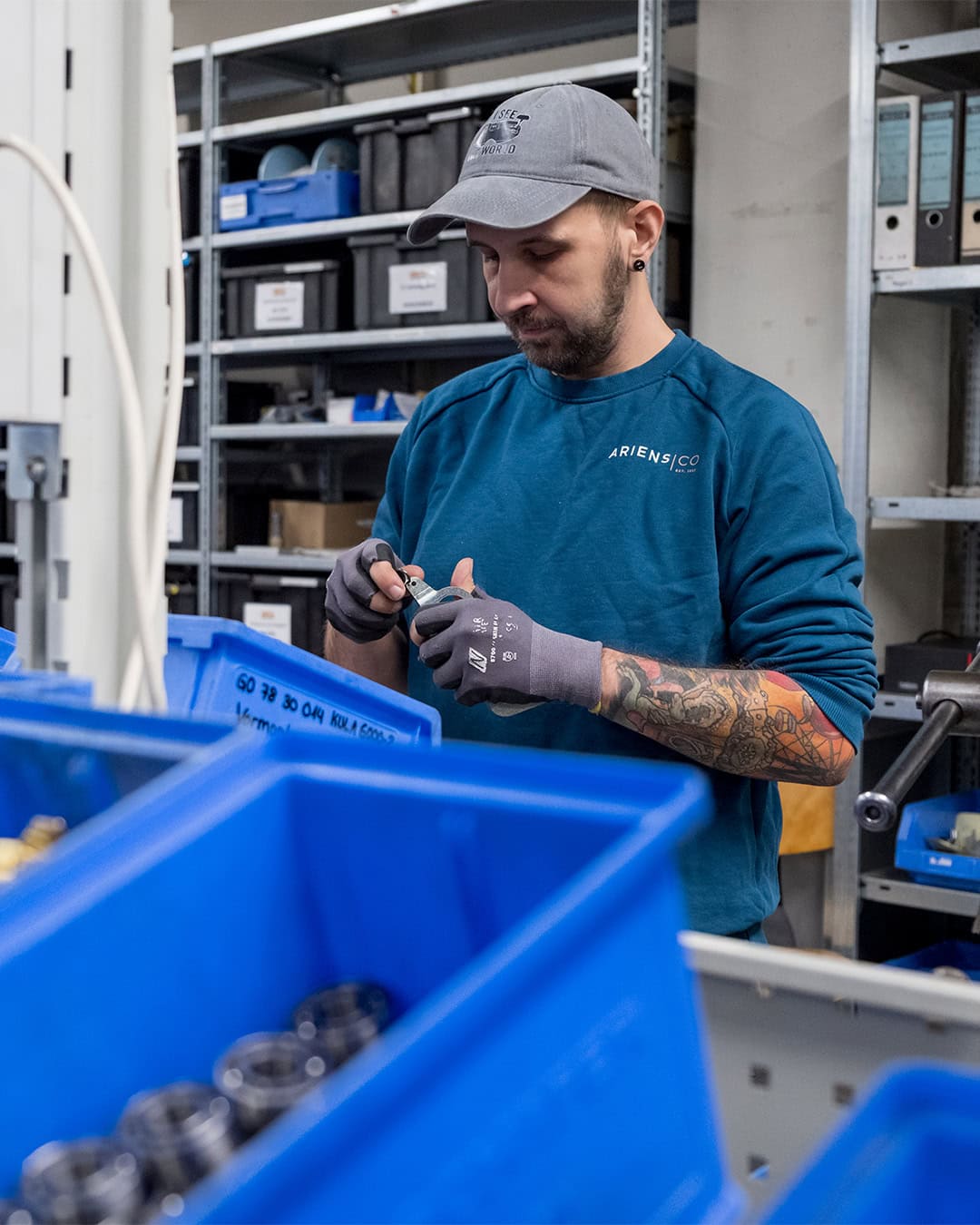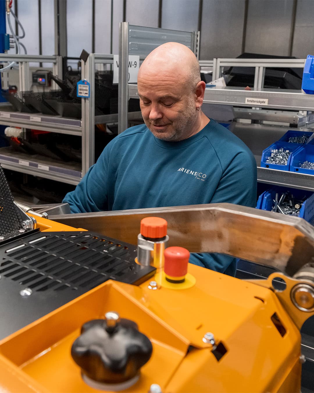 Factory worker of AriensCo EMEAA wearing their new turquise work wear inside their factory in Bühlertann, Germany