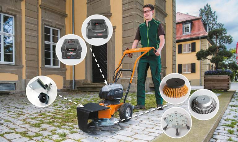 Todos los cepillos, portacepillos, 3ª rueda de apoyo, baterías y cargadores que puedes encontrar bajo accesorios y añádalos a la unidad básica AS 30 en función de sus necesidades.