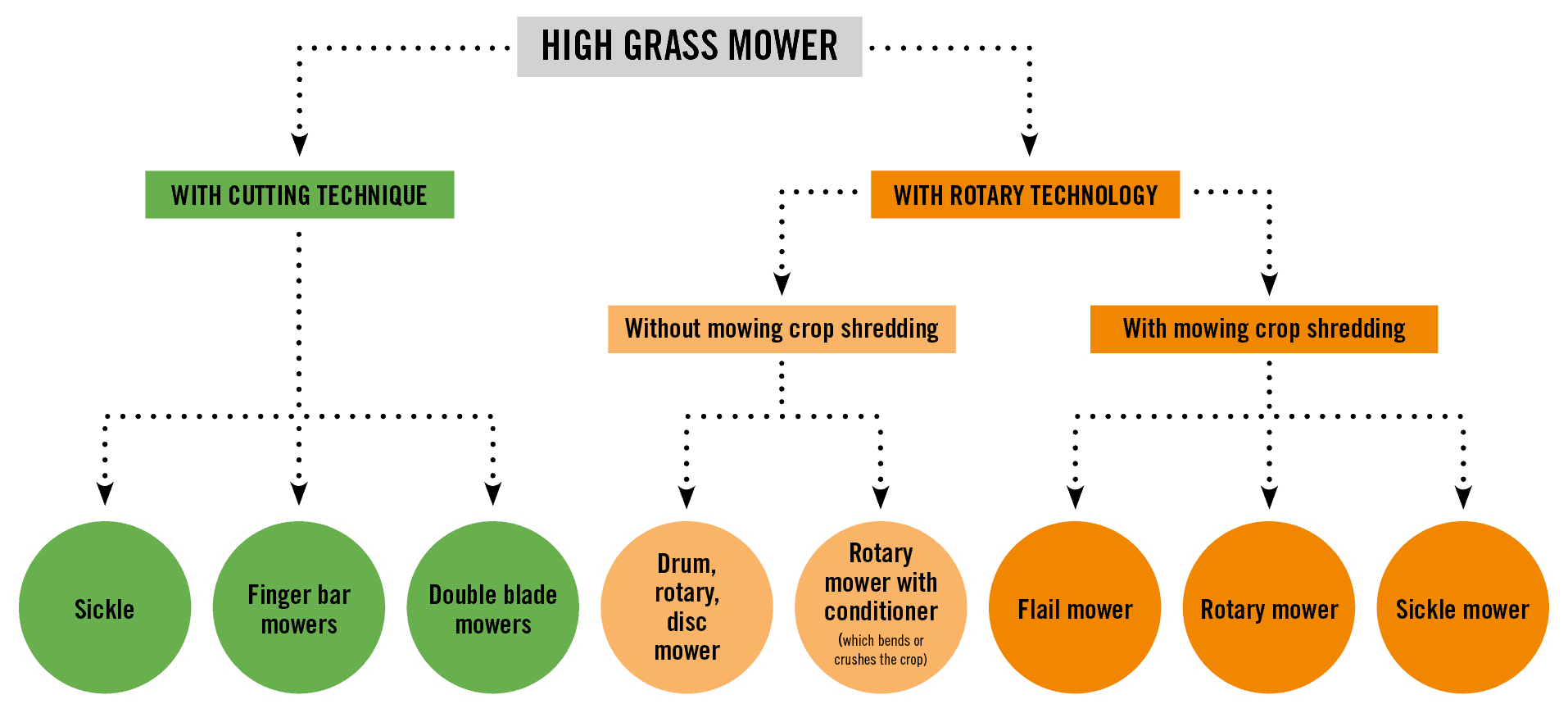 A intervalos cortos, la hierba puede secarse volteándola y luego usarse como heno. Los recortes pueden retirarse manualmente, con un carromato cargador o con una prensa enfardadora.