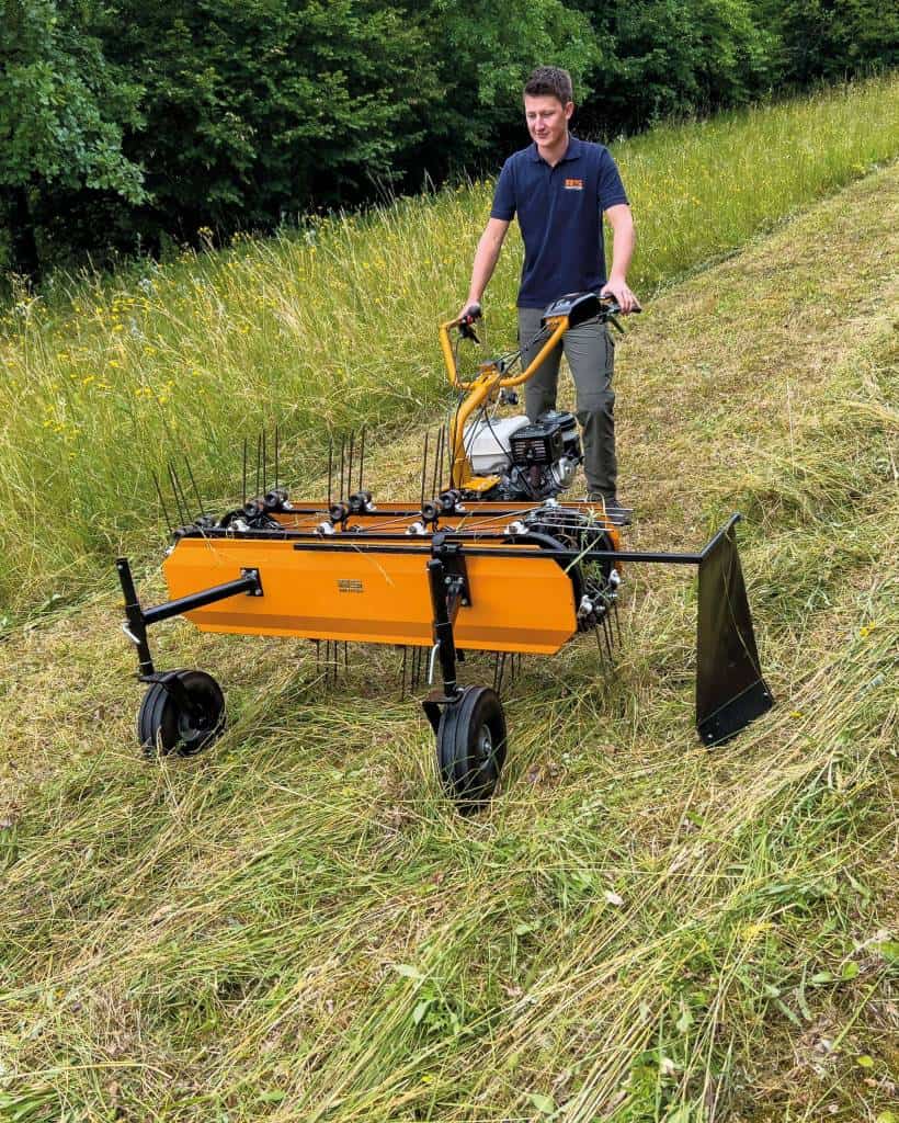 Las técnicas de corte de hierba oscilantes, mejor conocidas como «segadoras de barra», son particularmente suaves con los insectos y pequeñas criaturas. Las cuchillas triangulares que funcionan una contra la otra cortan la hierba limpiamente como tijeras. Las hierbas y plantas permanecen en la superficie intactas y sin aplastar, donde comienzan a secarse.