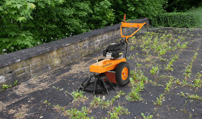 Cobblestones and uneven paved areas can be treated for weeds, without the use of chemicals, using mechanical methods. The agile AS 30 is designed for work close to edges, water inlet channels, manholes and on traffic islands with posts and signs. -